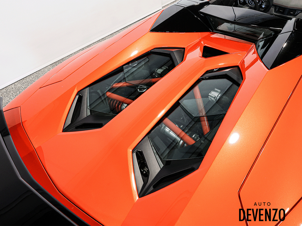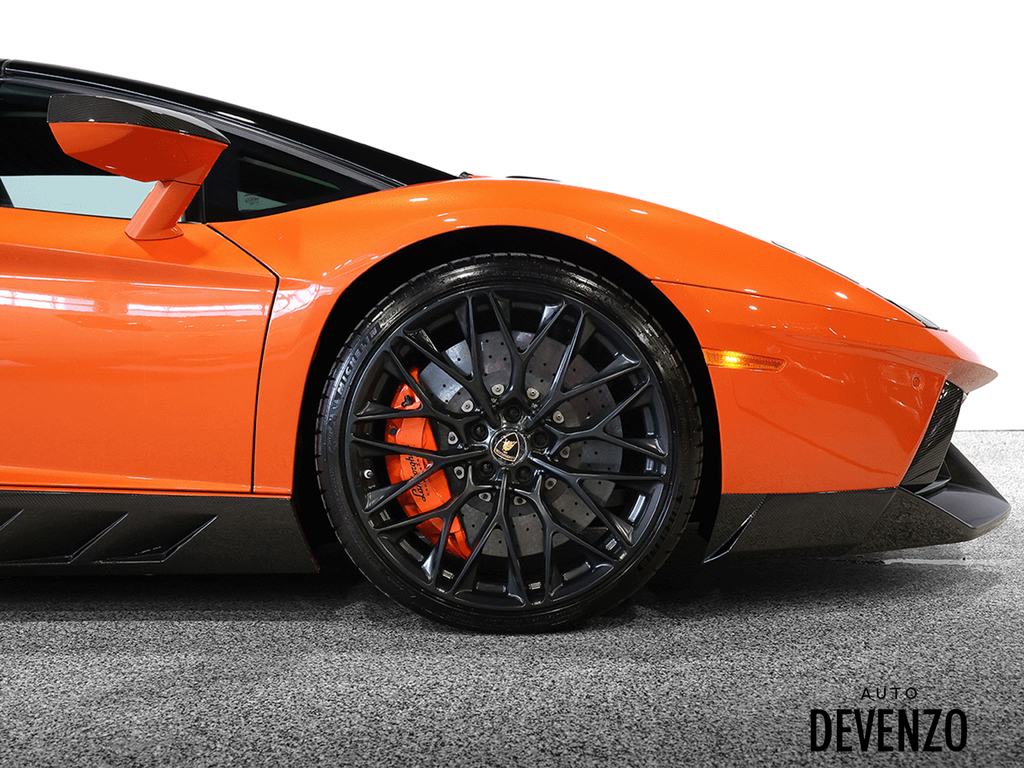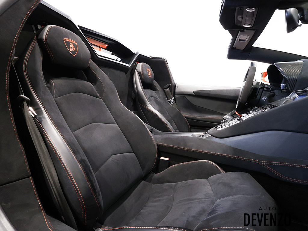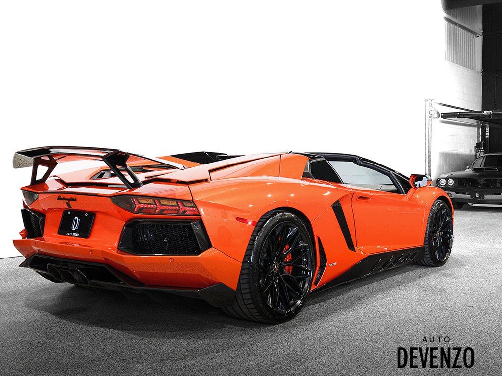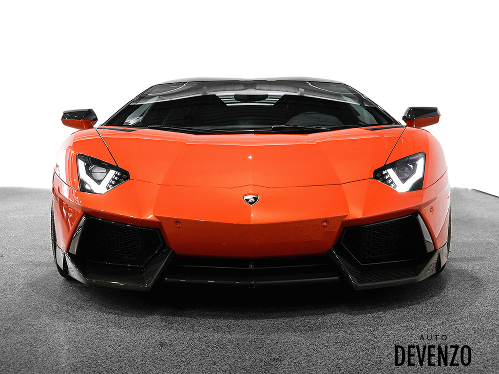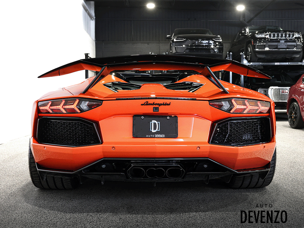 Immaculate 2014 Lamborghini Aventador Roadster LP700-4 700hp V12 6.5L, Orange on Black Alcantara Seats with Embroided Logo on Headrests, Carbon Fiber Exterior Body Kit which included Front Lower Bumper, Side Skirts, Rear Diffuser to add to the already exhaustive list of Carbon Factory Options such as Mirrors, Side Vents, Hood Flaps, Carbon Fiber Complete Interior - Dash, Center Console, Door Trims. Custom Rear Wing. Custom Exhaust. Full Front End PPF Clear. No Accidents, Immaculate Condition.***Please Note HRE Wheels are Not Included in the sale Price***Included Factory Lamborghini Wheels*** Auto Devenzo, Le Nouveau Bijou Des Concessionaires Usagés de Luxe au Canada Venez Vivre Une Experience Et Un Service Vip Hors Du Commun. Transport Partout Au Canada , Facetime / Video Sur Demande. Nous Offrons Le Meilleur Programme De Garantie Prolongée Pour Véhicule Haut De Gamme. Nous Reprenons Tous Vos Échanges Auto Devenzo, Devenez Propriétaire de la Voiture de Vos Reves !! Financement & Leasing Credit-Bail Disponible Come Visit Our New Showroom Of Exclusive Vehicles Of All Makes And See Why We Are The New Jewel Of Used Car Dealers In Quebec Transport All Over Canada Premium Extended Warranty Available For High End Vehicles Valid Across The Country Financing And Leasing Available And Trade-ins Are Welcome.