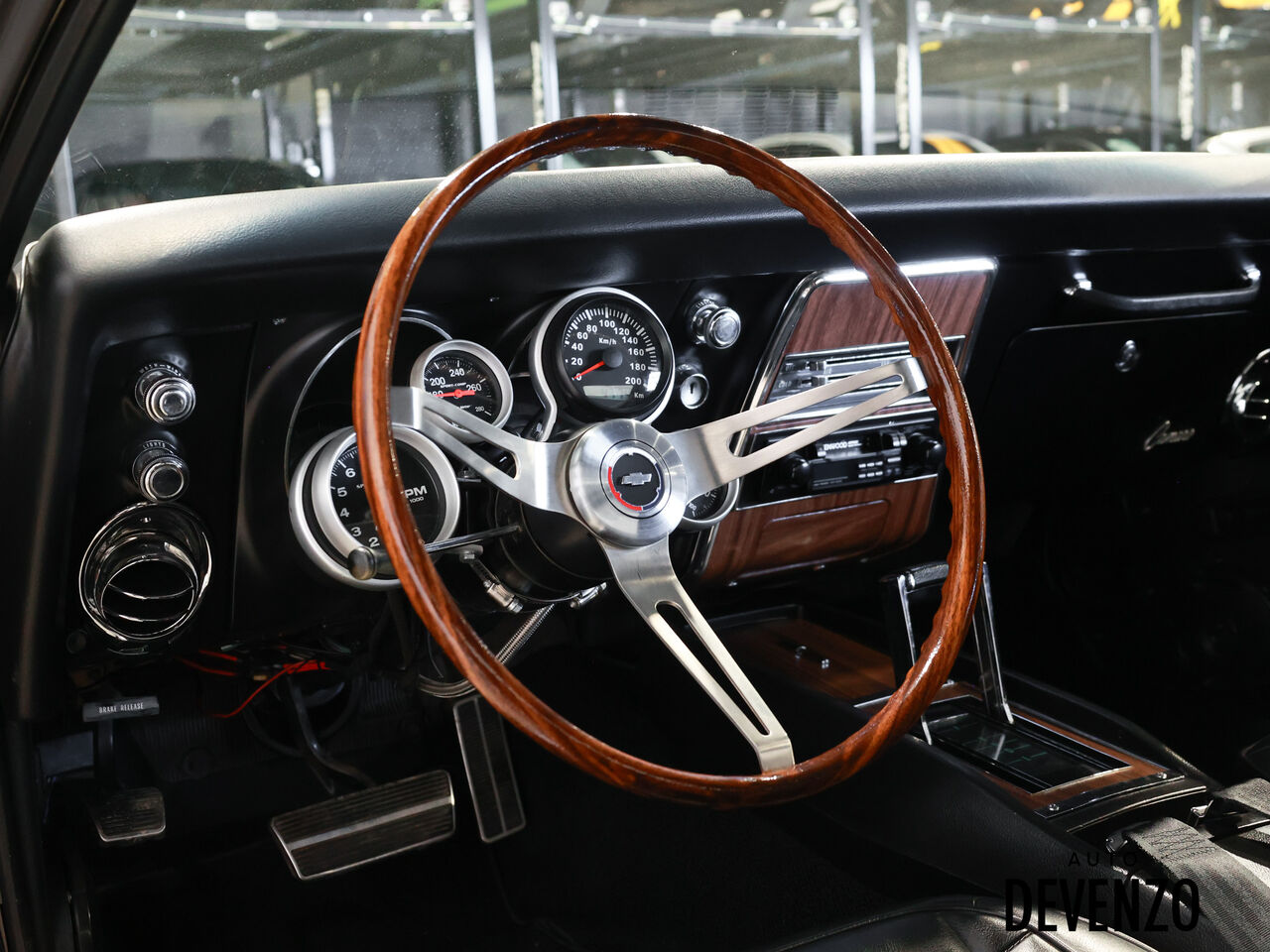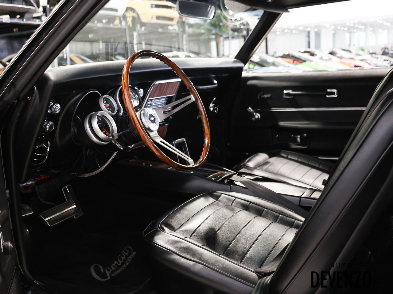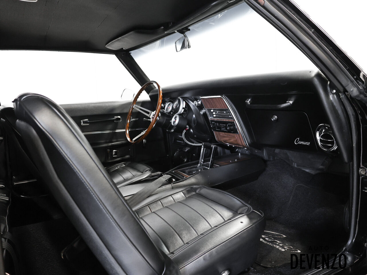L’habitacle a aussi été restauré avec goût, en conservant l’esprit d’origine tout en ajoutant une touche plus performante, avec entre autres un volant GM rosewood, des jauges Autometer, un intérieur refait, ainsi qu’un système audio Kenwood / Pioneer. À l’extérieur, la carrosserie restaurée, le capot acier, le spoiler arrière et la finition noire profonde donnent à cette Camaro une allure agressive, classique et intemporelle.