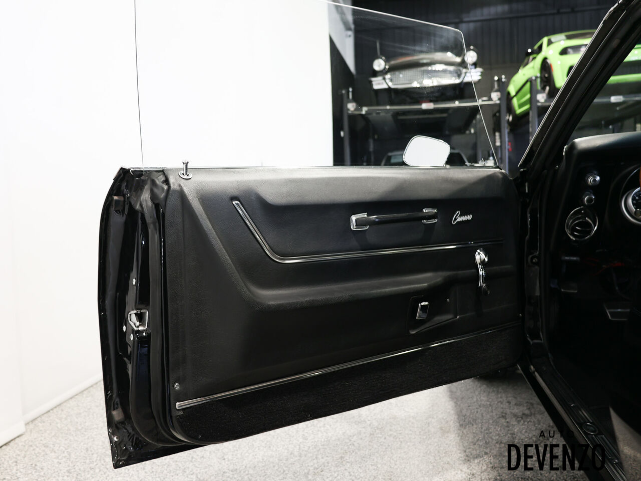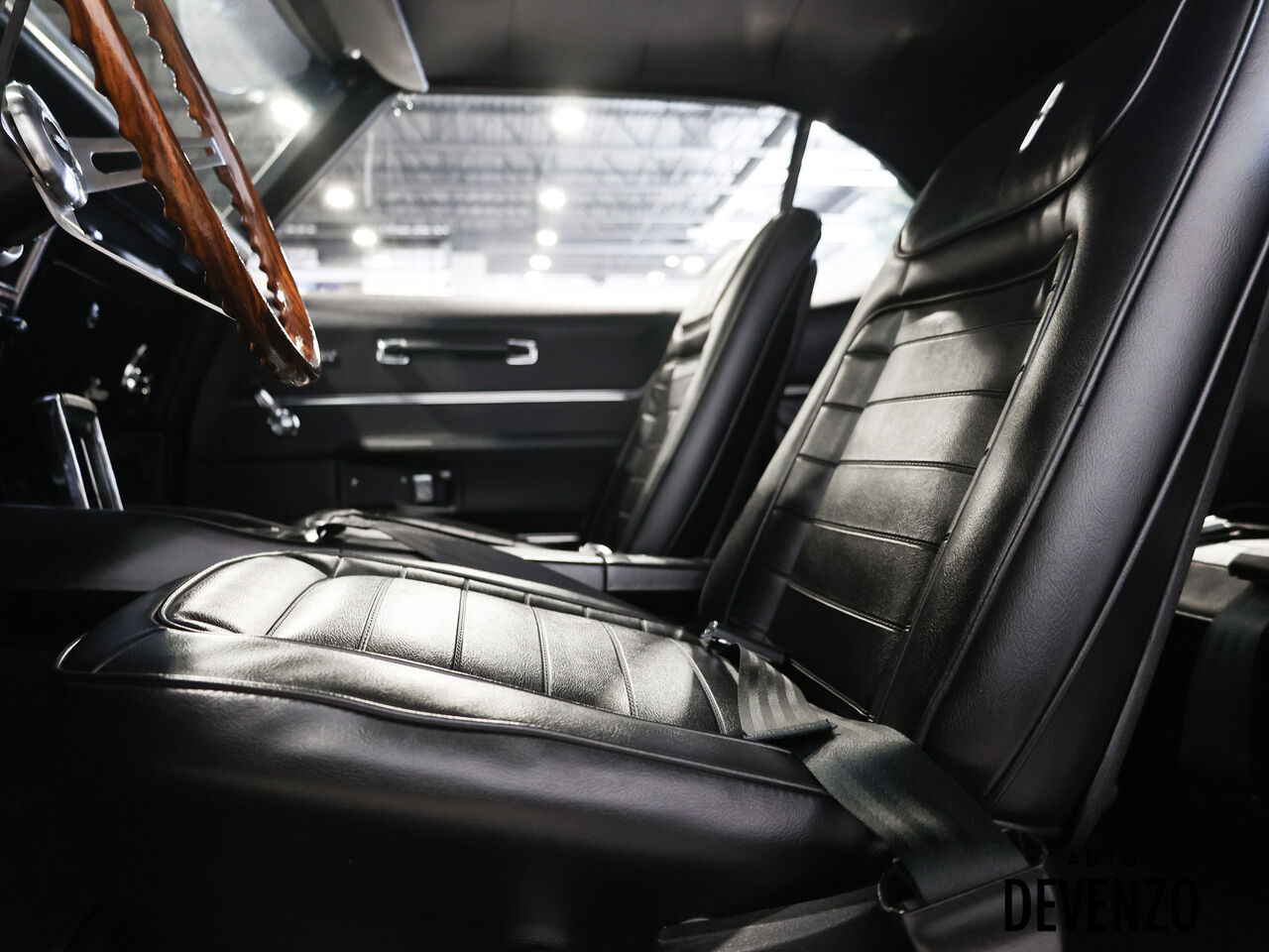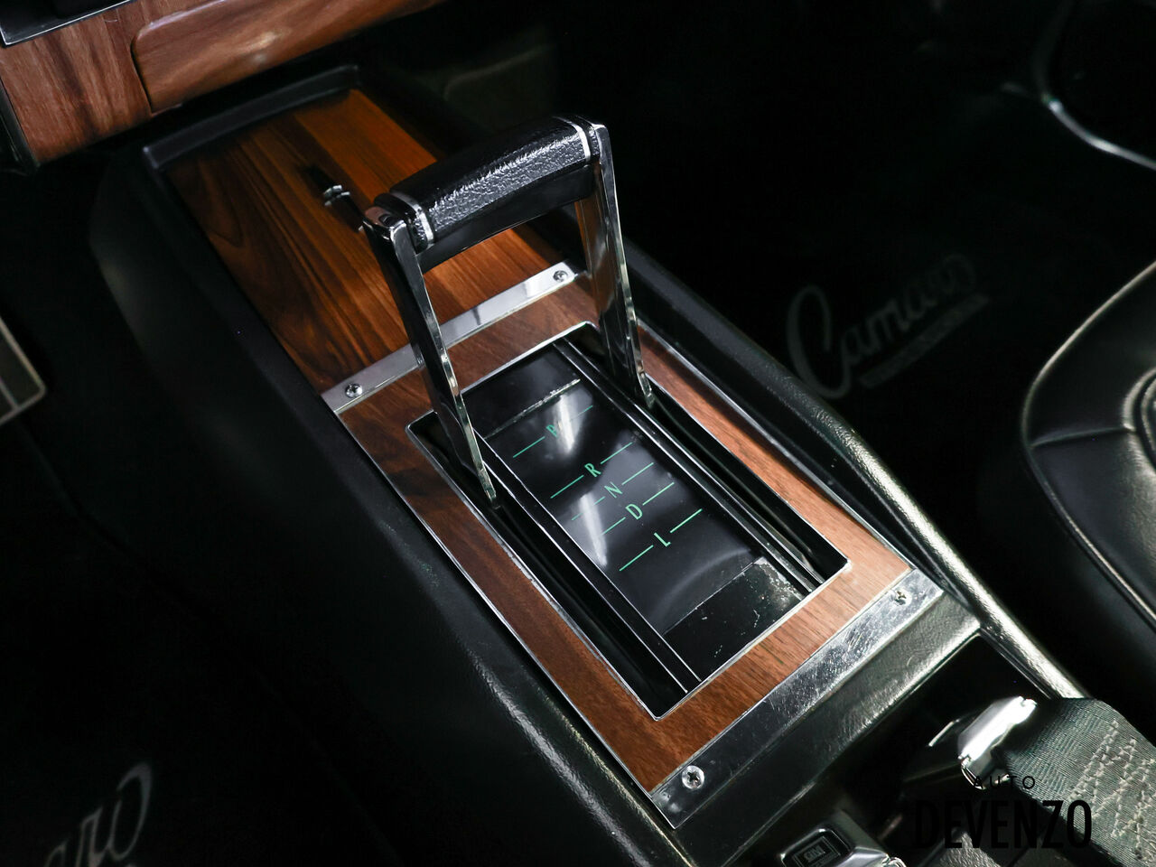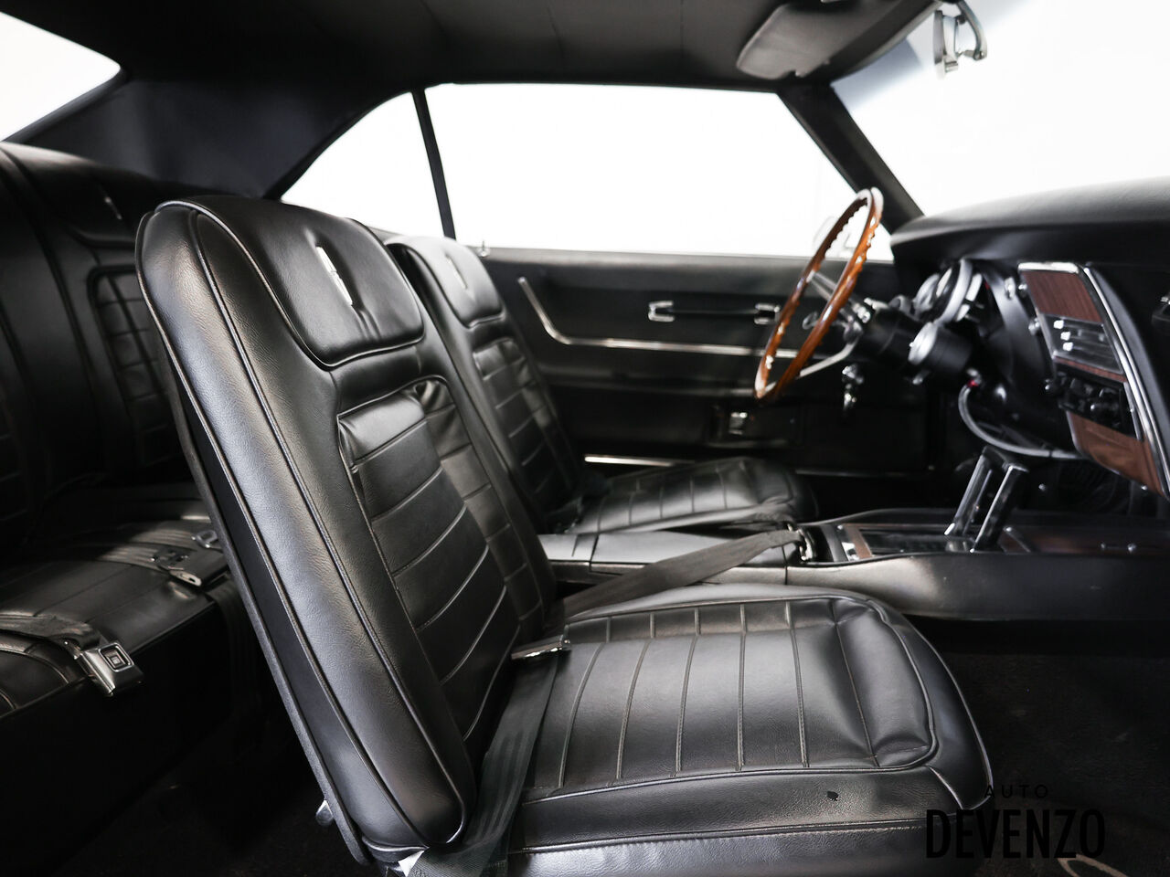 L’habitacle a aussi été restauré avec goût, en conservant l’esprit d’origine tout en ajoutant une touche plus performante, avec entre autres un volant GM rosewood, des jauges Autometer, un intérieur refait, ainsi qu’un système audio Kenwood / Pioneer. À l’extérieur, la carrosserie restaurée, le capot acier, le spoiler arrière et la finition noire profonde donnent à cette Camaro une allure agressive, classique et intemporelle.